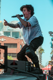 TX2 kicked off the day and didn’t waste any time because by the first couple songs, he had already jumped off the stage and into the crowd. A little circle pit kind of formed around him and there was somebody with a “TX2 saved my life sign” which I thought was sweet. They carried explosive energy throughout their whole set and even during their last song, he jumped down onto the barricade again and was trading Pokémon cards with fans.